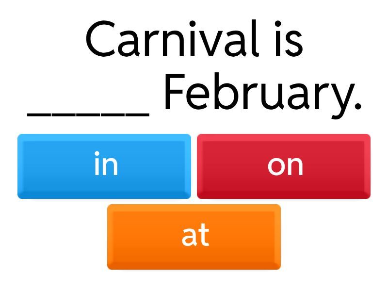 1) Carnival is _____ February. a) in b) on c) at 2) My birthday is ______ November 2nd. a) in b) on c) at 3) My English class is _____ Mondays and Wednesdays. a) in b) on c) at 4) My birthday party is _____ the 28th. a) in b) on c) at 5) The movie is _____ 7 p.m. a) in b) on c) at 6) Christmas is _____ December a) in b) on c) at 7) Halloween is ____ October 31st. a) in b) on c) at 8) My son's birthday is ____ May. a) in b) on c) at 9) The soccer game is _____ Sunday, ____ the evening. a) in - in b) on - at c) on - in 10) The meeting is ____ Thursday, _____ 3 p.m. a) in - at b) on - on c) on - at 11) The school concert is ____ July. a) in b) on c) at 12) The dinner is ____ Friday. a) in b) on c) at 13) The game is ____ noon, ____ the 27th. a) in - on b) on - in c) at - on