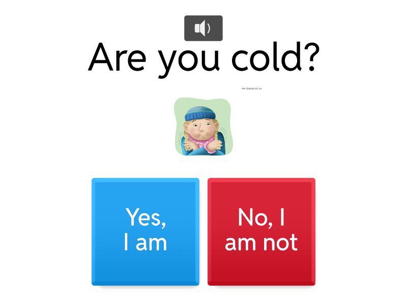 1) Are you cold? a) Yes, I am b) No, I am not 2) Is she bored? a) Yes, she is b) No, she isn't 3) Are you thirsty? a) Yes, I am b) No, I am not 4) Is she excited? a) Yes,she is b) No, she isn't 5) Is he sick? a) Yes, he is b) No, he isn't 6) Are you sick? a) Yes, I am b) No, I am not 7) Is he thirsty? a) Yes, he is b) No, he isn't 8) Is she sad? a) Yes, she is b) No, she isn't 9) Is she hot? a) Yes, she is b) No, she isn't 10) Is he sad? a) Yes, he is b) No, he isn't 11) Are you happy? a) Yes, I am b) No, I am not 12) Is she happy? a) Yes, she is b) No, she isn't