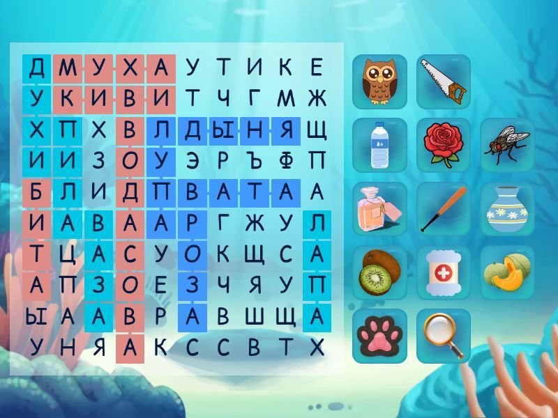 БИТА, ВАЗА, ВАТА, ВОДА, ДУХИ, ДЫНЯ, КИВИ, ЛАПА, ЛУПА, МУХА, ПИЛА, РОЗА, СОВА,