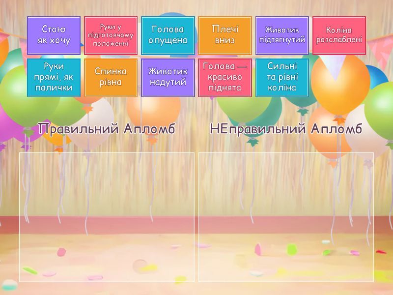 Правильний Апломб: Сильні та рівні коліна, Животик підтягнутий, Спинка рівна, Руки у підготовчому положенні, Голова — красиво піднята, Плечі вниз, НЕправильний Апломб: Голова опущена, Стою як хочу, Коліна розслаблені, Руки прямі, як палички, Животик надутий,