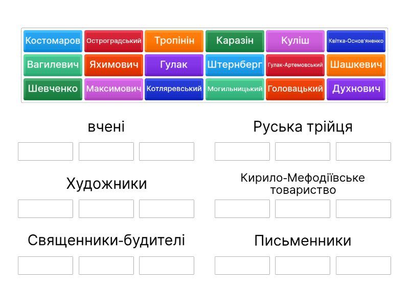 вчені: Каразін, Максимович, Остроградський, Руська трійця: Шашкевич, Вагилевич, Головацький, Художники: Шевченко, Тропінін, Штернберг, Кирило-Мефодіївське товариство: Костомаров, Куліш, Гулак, Священники-будителі: Духнович, Могильницький, Яхимович, Письменники: Котляревський, Квітка-Основ'яненко, Гулак-Артемовський,