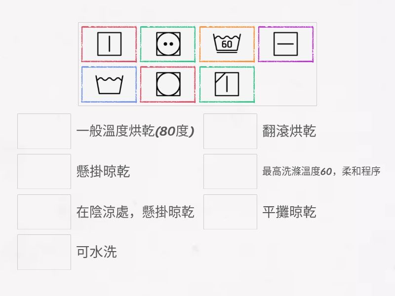 可水洗, 手洗,最高洗滌溫度40, 不可水洗, 最高洗滌溫度40,標準程序, 最高洗滌溫度40,極輕柔程序, 最高洗滌溫度60,標準程序, 最高洗滌溫度60,柔和程序, 乾洗, 不可乾洗, 可漂白, 不可漂白, 翻滾烘乾, 較低溫度烘乾(60度), 一般溫度烘乾(80度), 不可烘乾, 平攤晾乾, 懸掛晾乾, 在陰涼處,懸掛晾乾, 在陰涼處,平攤晾乾, 熨燙, 不可熨燙,
