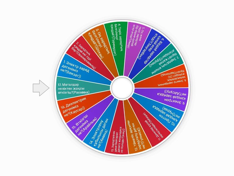 1) 1. Электр заряд дегеніміз не?(Бекзат)) 2) 2. Зарядтың қандай екі түрі бар?(Оразмұхаммед) 3) 3. Оң зарядтың белгіленуі қандай?(Шохан) 4) 4. Теріс зарядтың белгіленуі қандай?(Туремурат) 5) 5. Оң және теріс зарядтар бір-біріне қалай әсер етеді?(Амир) 6) 6. Бірдей зарядтар қалай әсер етеді?(Заңғарбек)) 7) 7. Зарядтың өлшем бірлігі қалай аталады?(Ерұлан)) 8) 8. Электр зарядының халықаралық жүйедегі (SI) бірлігі?(әділахад)) 9) 9. Электрон қандай зарядқа ие?(Айсұлу)) 10) 10. Протон қандай зарядқа ие?(Нұрай) 11) 11. Денелер қалай зарядталады?(Айзере) 12) 12. Үйкеліс арқылы зарядталу деген не?(Гүлниса)) 13) 13. Зарядталған дене бейтарап денеге жақындаса не болады?(Інжу)) 14) 14. Электрлену құбылысы деген не?(Амина) 15) 15. Өткізгіш дегеніміз не?(Арайлым) 16) 16. Диэлектрик дегеніміз не?(Каусар)) 17) 17. Металдар неліктен жақсы өткізгіш?(Рахмина)