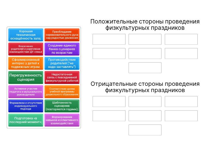 Положительные стороны проведения физкультурных праздников: Соответствие целям учебной программы дошкольного образования, Хорошая техническая оснащённость зала;, Активное участие педагога и музыкального руководителя, Сформированный интерес у детей к подвижным играм., Создание единого банка сценариев по возрастам, Формирование навыков коллективного взаимодействия, Вовлечение родителей и укрепление взаимодействия ДУ–семья, Отрицательные стороны проведения физкультурных праздников: Перегруженность сценария, Подготовка «в последний момент»;, Шаблонность сценариев (повторяются годами);, Преобладание соревновательного духа над радостью движения, Формализм и отсутствие индивидуального подхода, Недостаточная связь с повседневной физкультурной работой, Противодействие родителей ("не надо заставлять"),