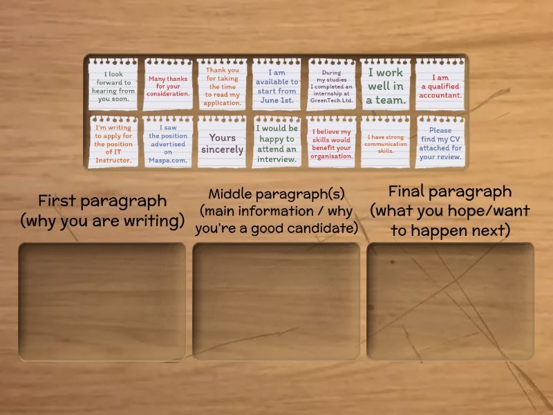 First paragraph (why you are writing): I'm writing to apply for the position of IT Instructor., I saw the position advertised on Maspa.com., Middle paragraph(s) (main information / why you're a good candidate): I have strong communication skills., I am a qualified accountant., I work well in a team., During my studies I completed an internship at GreenTech Ltd., I believe my skills would benefit your organisation., Please find my CV attached for your review., Final paragraph (what you hope/want to happen next): I would be happy to attend an interview., I am available to start from June 1st., I look forward to hearing from you soon., Thank you for taking the time to read my application., Many thanks for your consideration., Yours sincerely,