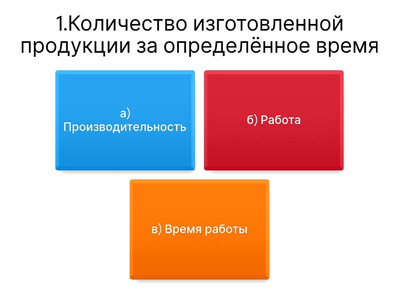 1) 1.Количество изготовленной продукции за определённое время a) а) Производительность b) б) Работа c) в) Время работы 2) 2. Скорость работы a) а) Производительность b) б) Работа c) в) Время работы 3) 3. Измеряется в часах, минутах, секундах a) а) Производительность b) Работа c) в) Время