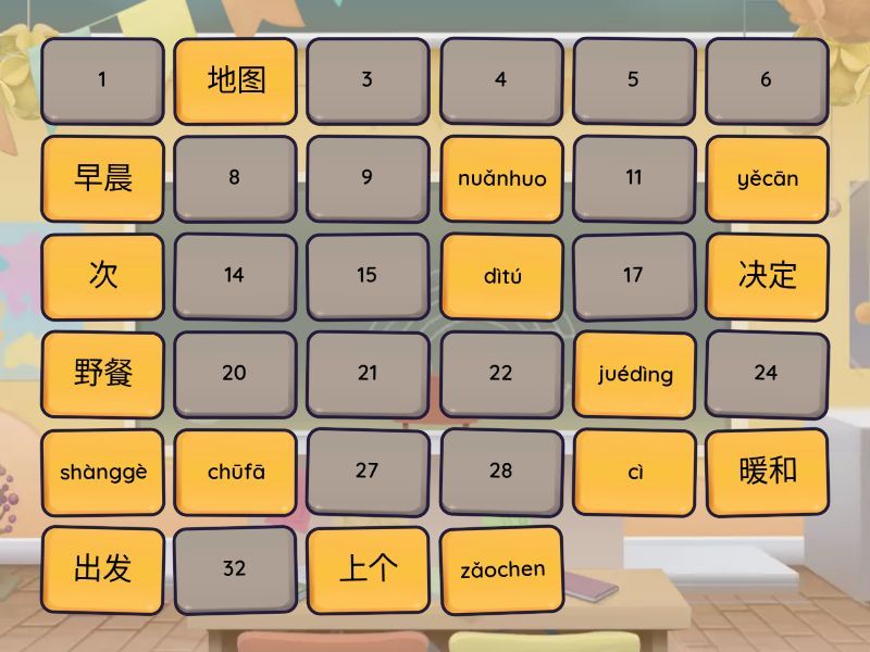次 - cì, 野餐 - yěcān, 上个 - shànggè, 暖和 - nuǎnhuo, 决定 - juédìng, 早晨 - zǎochen, 出发 - chūfā, 地图 - dìtú, 风景 - fēngjǐng, 才 - cái, 发现 - fāxiàn, 周 - zhōu, 白天 - báitiān, 阴 - yīn, 转 - zhuǎn, 晴 - qíng, 夜间 - yèjiān,
