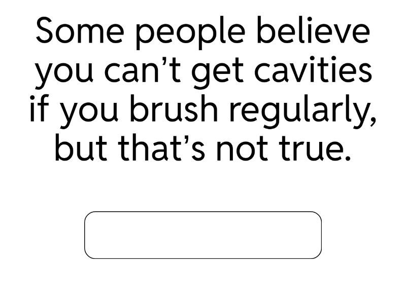 If you want to keep your teeth healthy, there are a few simple things you must do every day., First, you should brush your teeth at least twice a day, and don’t forget to floss, It may help prevent gum disease., You could also consider using mouthwash, especially if you’ve had problems with your gums before., Be careful with sugary snacks — they might seem harmless,..., ...but they can cause serious damage over time., Some people believe you can’t get cavities if you brush regularly, but that’s not true., That’s why regular dental checkups are important — your dentist will be able to spot problems early..