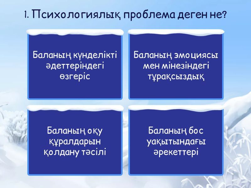 1) 1. Психологиялық проблема деген не? a) Баланың күнделікті әдеттеріндегі өзгеріс b) Баланың эмоциясы мен мінезіндегі тұрақсыздық c) Баланың оқу құралдарын қолдану тәсілі d) Баланың бос уақытындағы әрекеттері 2) Ерте анықтаудың негізгі себебі қандай? a) Проблеманың тереңдеп кетуін болдырмау b) Баланың оқу мотивациясын көтеру c) Мұғалімнің жұмысын жеңілдету d) Ата-ананың тапсырмасын азайту 3) Бақылау әдісінің басты ерекшелігі қандай? a) Баланың жан-жақты тест тапсырмаларын орындауы b) Баланың табиғи жағдайда еркін әрекетін бақылау c) Баланың ата-анасымен арнайы сұхбат алу d) Баланың жеке қабілетін сұрақ арқылы тексеру 4) Әңгімелесу әдісінде не маңызды? a) Баланың жедел тапсырмаларды орындауы b) Баланың жазбаша тест толтыруы c) Баланың топтық ойынға қатысуы d) Баланың еркін сөйлеп өз ойын айтуы 5) Эмоциялық қиындыққа жататын белгі қайсы? a) Зейіннің тұрақсыздығы b) Сабаққа бейімделмеу c) Қорқыныш пен уайым сезімдері d) Қарым-қатынас орната алмау 6) Мінез-құлықтық қиындықтың мысалы қайсы? a) Есте сақтаудың төмендігі b) Мотивацияның болмауы c) Уайым мен қобалж d) Агрессия мен тұйықтық 7) Арт-терапияның негізгі мақсаты қандай? a) Баланың логикалық ойлауын дамыту b) Баланың эмоциясын шығармашылықпен шығару c) Баланың оқу техникасын жақсарту d) Баланың әлеуметтік орнын анықтау 8) Релаксация техникасының басты әсері неде? a) Баланың эмоциясын тұрақтандыру b) Баланың белсенділігін арттыру c) Баланың есте сақтауын өсіру d) Баланың мінезін өзгерту 9) Топтық ойындар не үшін қолданылады? a) Баланың жеке темпераментін анықтау үшін b) Баланың жазу жылдамдығын арттыру үшін c) Баланың қарым-қатынас дағдысын дамыту үшін d) Баланың ойлау қабілетін арттыру үшін 10) Психологиялық көмектің нәтижесін қалай анықтауға болады? a) Балада сабақ кестесінің өзгеруі арқылы b) Балада үй тапсырмасының көбейуі арқылы c) Балада жаңа пәндерге қызығушылықтың артуы арқылы d) Балада эмоциялық тұрақтылық пайда болуы арқылы
