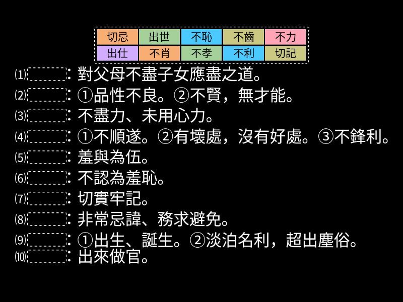 ⑴____:對父母不盡子女應盡之道。 ⑵____:①品性不良。②不賢,無才能。 ⑶____:不盡力、未用心力。 ⑷____:①不順遂。②有壞處,沒有好處。③不鋒利。 ⑸____:羞與為伍。 ⑹____:不認為羞恥。 ⑺____:切實牢記。 ⑻____:非常忌諱、務求避免。 ⑼____:①出生、誕生。②淡泊名利,超出塵俗。 ⑽____:出來做官。 ⑴~⑽ ◎手部潮溼時,____碰觸電器插頭與插座。  類似的居家安全常識,你務必____在心。 ◎陶淵明不願____為五斗米折腰,  選擇過著____的隱居生活。 ◎驕矜狂妄的態度令人____,能做到____下問,  才可以贏得他人的敬重。 ◎他辦事____,使得情勢對我們相當____,  應該換人去處理這件事。 ◎這名____之徒搶劫路人皮包被逮後,  還對前來求情的母親大聲咆哮,實在非常____。 (11)____:儀表容貌。 (12)____:人死後的容貌或生前的肖像。 (13)____:自我期許,含有自負、自信之意。 (14)____:自誇、自耀。 (15)____:冒險。 (16)____:艱難困苦的處境。 (17)____:指人民依法律規定得享有並受法律保護的地位或利益。 (18)____:具有控制、指揮等影響的力量。 (19)____:在報刊或布告欄上的公開聲明。 (20)____:使人有所領悟的啟發與指示。 (11)~(20) ◎這則走失老人的尋人____,給予我  要格外留意失智老人的____。 ◎他____能有高尚的君子品德,而你不過  做了一件小事就____為孔明再世,真是可鄙。 ◎出門前整理____,屬於一種禮貌;  為往生者修飾____,則是一種尊重。 ◎他倆共同經歷一段冒險____的旅程,  最後成為____之交。 ◎憲法規定,人民有選舉、應考試及服公職等____,  而總統則是____的最高擁有者。 (21)____:獲得勝利。 (22)____:制服別人而使自己得到勝利。 (23)____:對傷害自己的人,以類似的手段進行反擊。 (24)____:心中有所懷抱。指志向、理想、願望。 (25)____:(1)修治涵養使學問道德臻於精美完善。(2)品德、風度。 (26)____:休息調養。 (27)____:(1)作品的布局、架構。(2)文學的類別。 (28)____:文學或藝術作品中,表現主題所用的材料。 (29)____:本身。 (30)____:控制自己激動的情緒。 (21)~(30) ◎因傷____一段時日後,他的____也隨之  明顯提升,從一個莽夫蛻變成謙謙君子。 ◎聽到好友要與我絕交的消息,我躲在____房間  裡,傷心得不能____。 ◎她以童年生活為____,分別運用散文及小說  等各種不同____,完成多部精采的作品。 ◎有____的青年,絕不會做出  這種____他人的卑鄙行為。 ◎除了出奇____之外,團隊精神及合作默契  也是我們____的主要原因。 (31)____:由特定事物的刺激所引發的回響。 (32)____:①指物體因光線反照,映射成像。      ②由某事物的一定狀態和關係而產生與它相符的現象。      ③將客觀的情況或意見向上級陳述。 (33)____:到某個時期即停止進行。(強調「停止」或「終止」) (34)____:到某一個時候即停止。(表示「到達某個時間點為止」) (35)____:關於公共性的道德準則與行為。 (36)____:①功業與德行。②佛教稱行善所生的利益。 (37)____:①一定、必定。②強調命令語氣。 (38)____:必然需要。 (39)____:對做事的人所提供的酬資、回饋。 (40)____:以行動來打擊仇敵。 (31)~(40) ◎一個人若缺少____心,要他捐款  興建公共建設來積____,恐怕很難! ◎若能夠放下____的想法,  就是給予心靈最大的____。 ◎這部電影____出真實人生,  因而民眾的____十分熱烈。 ◎徵文活動到月底才____,____目前  為止, 主辦單位已收到數百篇文章。 ◎衛生紙是生活____品,  請你今天____記得買回家。 (41)____:研究學問所達到的程度。 (42)____:求學的經歷。指畢業或肄業所得的學位。 (43)____:①不關心、不相關或無知覺。②寂靜無聲。 (44)____:突然。 (45)____:事先規定或約定。(如計畫、行程) (46)____:事先訂購。(如商品、座位) (47)____:更改、改換。 (48)____:毫無規律、不可揣測地變化。 (49)____:古代臣民或屬國獻與帝王的物品。 (50)____:祭拜祖宗、神明用的瓜果酒食。 (41)~(50) ◎這場舞台劇的燈光效果非常精彩,隨著劇情的推進  不斷____色彩;而演員精湛的演技,更是將  世事____莫測的感覺詮釋得淋漓盡致。 ◎這次舉辦的____測驗,是要檢視高中生  有沒有資格得到____證書。 ◎寺廟的供桌上擺滿了信徒敬奉的____,  而歷史博物館中則陳列著古代藩屬國  進獻給皇帝的珍貴____。 ◎為了確保假期順利,我們____了下週五出發的  行程,並已經____了前往花蓮的火車票和飯店房間。 ◎ ____回首,過去因好友背叛所帶來的  種種傷害,如今都已能夠____置之。
