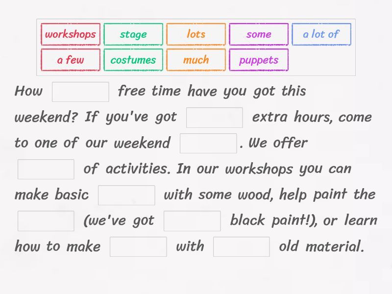 How ____ free time have you got this weekend? If you've got ____ extra hours, come to one of our weekend ____. We offer ____ of activities. In our workshops you can make basic ____ with some wood, help paint the ____ (we've got ____ black paint!), or learn how to make ____ with ____ old material.