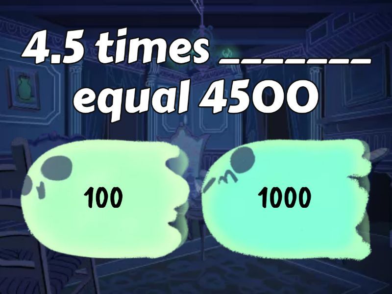 1) 4.5 times _______ equal 4500 a) 100 b) 1000 2) 58 divide ______ equal 0.58 a) 10 b) 100 3) 67 times ________ equal 6700 a) 100 b) 1000 4) 4.3 times ______ equal 430 a) 10 b) 1000 5) 0.48 times ______ equal 4800 a) 100 b) 1000 6) 4800 divide _____ equal 0.48 a) 1000 b) 100