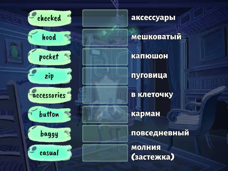 polka-dotted - в горошек, floral - цветочный, outfit - одежда, наряд, pattern - узор, sleeve - рукав, button - пуговица, zip - молния (застежка), collar - воротник, hood - капюшон, baggy - мешковатый, tight - тугой, обтягивающий, plain - простой, без рисунка, однотонный, loose - свободный, необтягивающий, smart - нарядный, casual - повседневный, material - ткань, материал, an item of clothes - предмет одежды, sripped - в полосочку, checked - в клеточку, footwear - обувь, pocket - карман, accessories - аксессуары,