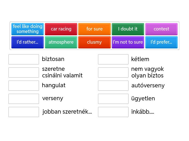 atmosphere - hangulat, car racing - autóverseny, change one's mind - meggondolja magát, clusmy - ügyetlen, contest - verseny, cup final - kupadöntő, drop by - beugrik, meglátogat, dry - száraz, feel like doing something - szeretne csinálni valamit, flyer - szórólap, for sure - biztosan, free entry - ingyenes belépés, from the comfort of one's home - az otthon kényelméből, give something a try - megpróbál valamit, ice skating - jégkorcsolyázik, make up one's mind - döntést hoz, rink - jégpálya, skate - korcsolyázik, track - pálya, do as you please - tégy, ahogy jónak látod, I doubt it - kétlem, I give up - feladom, I'd prefer... - jobban szeretnék..., I'd rather... - inkább...., I'm not to sure - nem vagyok olyan biztos, I'm positive - szerintem igen, It's up to you - tőled függ, there's a good chance... - jó esély van arra, hogy..., choice - választás,