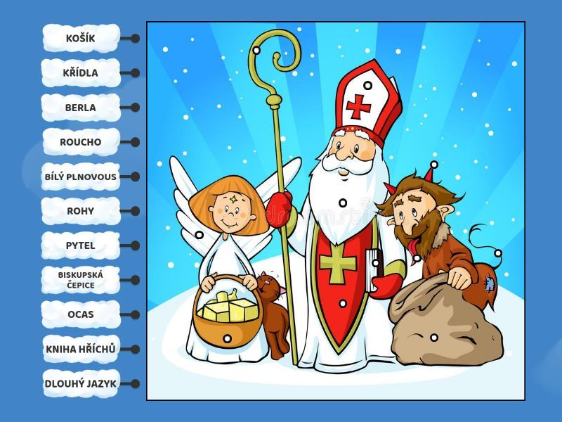 KŘÍDLA, KOŠÍK, BISKUPSKÁ ČEPICE, BERLA, ROUCHO, BÍLÝ PLNOVOUS, ROHY, DLOUHÝ JAZYK, PYTEL, OCAS, KNIHA HŘÍCHŮ.