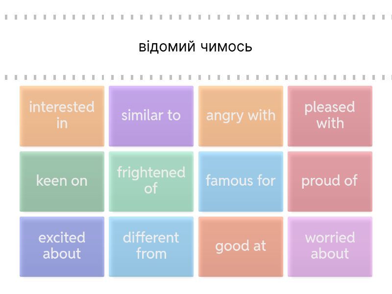 famous for - відомий чимось, proud of - пишатися кимось, чимось, interested in - цікавитися чимось, keen on - захоплюватися чимось, worried about - стурбований чимось, excited about - у захваті від чогось, frightened of - наляканий чимось, good at - умілий у чомусь, добре виходить щось, similar to - схожий на, different from - відмінний від, pleased with - задоволений чимось, angry with - злий через щось,