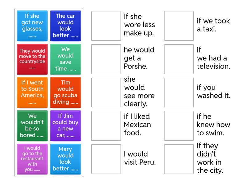 If I went to South America, ...... - I would visit Peru., Mary would look better ...... - if she wore less make up., We would save time ......  - if we took a taxi., If Jim could buy a new car, ......  - he would get a Porshe., We wouldn't be so bored ......  - if we had a television., They would move to the countryside ......  - if they didn't work in the city., I would go to the restaurant with you ......  - if I liked Mexican food., Tim would go scuba diving ......  - if he knew how to swim., If she got new glasses, ......  - she would see more clearly., The car would look better ......  - if you washed it.,