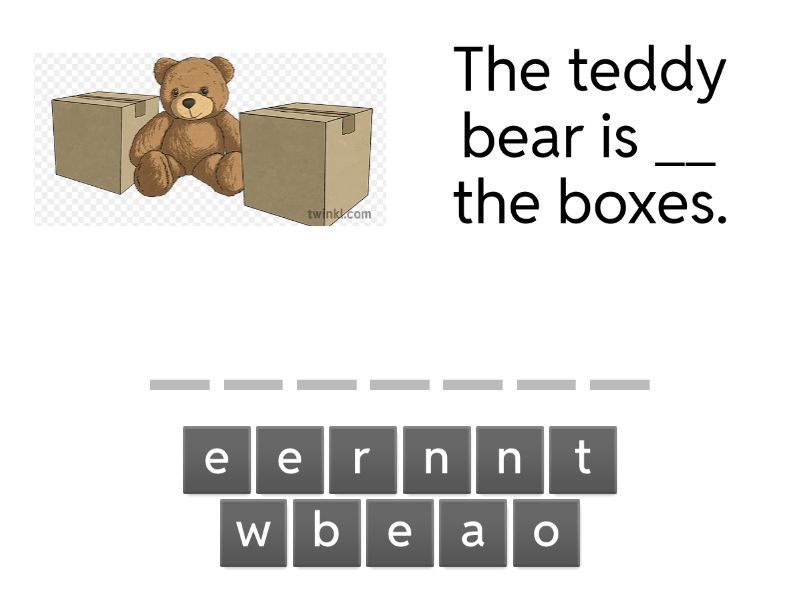 in - The shark is __ the bathtub., on - The lion is __ the ball., under - The dog is __ the table., on - The man is __ the moon., under - The man is __ the table., in - The dinosaur is __ the box., behind - The boy is __ the dad., next to - The elephant is __ the mouse., in front of - The boy is __ the ball., between - The teddy bear is __ the boxes., behind - The shark is __ the fish., in front of - The teacher is __ the student., opposite - The boy is ___ the girl., next to - The elephant is ___ the chair., between - The boy is ____________ the boxes.,