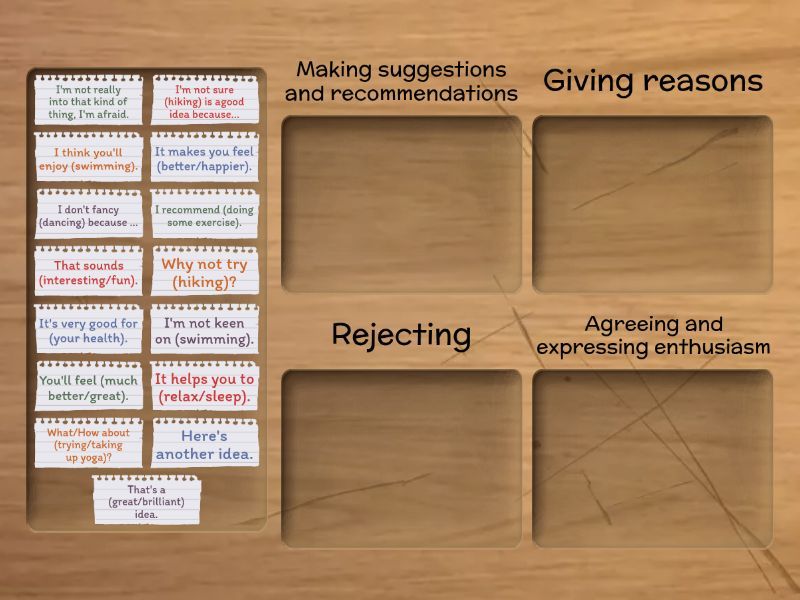 Making suggestions and recommendations: What/How about (trying/taking up yoga)?, Why not try (hiking)?, Here's another idea., I recommend (doing some exercise)., I think you'll enjoy (swimming)., Giving reasons: It's very good for (your health)., It helps you to (relax/sleep)., It makes you feel (better/happier)., You'll feel (much better/great)., Rejecting: I'm not sure (hiking) is agood idea because..., I'm not keen on (swimming)., I'm not really into that kind of thing, I'm afraid., I don't fancy (dancing) because ..., Agreeing and expressing enthusiasm: That's a (great/brilliant) idea., That sounds (interesting/fun).,