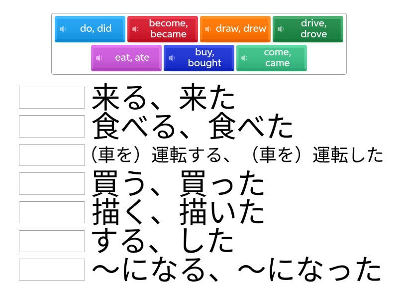 become, became - ~になる、~になった, begin, began - 始める、始まった, break, broke - こわす、こわした, bring, brought - 持ってくる、持ってきた, buy, bought - 買う、買った, catch, caught - つかまえる、つかまえた, come, came - 来る、来た, cut, cut - 切る、切った, do, did - する、した, draw, drew - 描く、描いた, drink, drank - 飲む、飲んだ, drive, drove - (車を)運転する、(車を)運転した, eat, ate - 食べる、食べた,