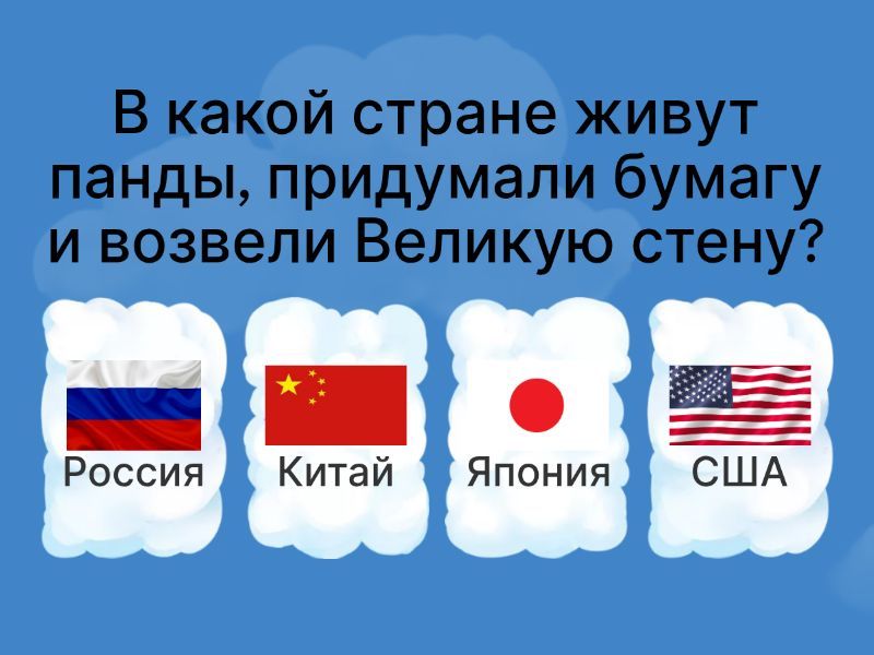 1) В какой стране живут панды, придумали бумагу и возвели Великую стену? a) Россия b) Китай c) Япония d) США 2) Какое этих деревьев является хвойным и не сбрасывает иголки? a) Береза b) Дуб c) Сосна d) Клен 3) Какой орган в твоем теле работает как насос и гоняет кровь по сосудам? a) Сердце b) Мозг c) Легкие d) Желудок 4) Какой город является столицей России? a) Казань b) Санкт-Петербург c) Сочи d) Москва 5) Какой овощ долго вытаскивали из земли в одной народной сказке? a) Репка b) Огурец c) Морковь d) Картошка