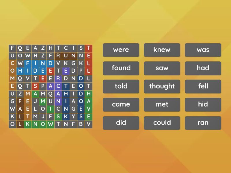 amis - was, are - were, see - saw, find - found, run - ran, dodoes - did, come - came, have - had, can - could, tell - told, hide - hid, fall - fell, think - thought, meet - met, know - knew,