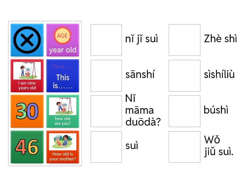 year old  - suì, how old are you?  - nǐ jǐ suì, I am nine years old - Wǒ jiǔ suì., this - zhè, Is this your sister? - Zhè shì nǐ jiějie ma?, This is…… - Zhè shì, this is China - zhè shì zhōngguó , elder sister - jiějie, No, this is my mother. - Búshì, zhè shì wǒ māma., búshì, How old is your mother? - Nǐ māma duōdà?, My mother is 35 years old. - Wǒ māma sānshíwǔ suì., sānshí, sìshíliù, shíliù,