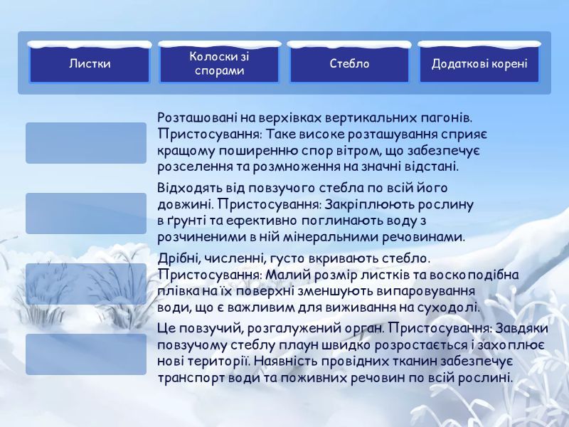 Стебло - Це повзучий, розгалужений орган. Пристосування: Завдяки повзучому стеблу плаун швидко розростається і захоплює нові території. Наявність провідних тканин забезпечує транспорт води та поживних речовин по всій рослині., Листки - Дрібні, численні, густо вкривають стебло. Пристосування: Малий розмір листків та воскоподібна плівка на їх поверхні зменшують випаровування води, що є важливим для виживання на суходолі., Додаткові корені - Відходять від повзучого стебла по всій його довжині. Пристосування: Закріплюють рослину в ґрунті та ефективно поглинають воду з розчиненими в ній мінеральними речовинами., Колоски зі спорами - Розташовані на верхівках вертикальних пагонів. Пристосування: Таке високе розташування сприяє кращому поширенню спор вітром, що забезпечує розселення та розмноження на значні відстані.,