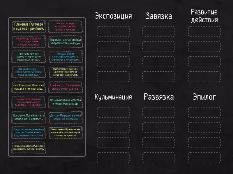 Экспозиция: Детство Петрушки в семье небогатого помещика., Решение отца отправить сына «служить, да не баловать» — в Оренбург., Передача наказа Гринёву: «Береги честь смолоду»., Завязка: Путешествие Гринёва в Оренбург и встреча со встречным «вожатым»., Проигрыш Гринёва Зурину — характерная первая ошибка героя., Дар «вожатому» — заячий тулупчик, который позже сыграет роль., Развитие действия: Приезд Гринёва в Белогорскую крепость, знакомство с Мироновыми., Возникновение чувства к Маше Мироновой., Конфликт со Швабриным: шутки, клевета, дуэль., Письмо отцу с просьбой благословить брак с Машей Мироновой, Кульминация: Восстание Пугачёва и его нападение на крепость., Казнь коменданта Миронова и сложность выбора Гринёва., Помилование Пугачёвым — «вожатый», спасение героя и отъезд из крепости., Развязка: Помощь Пугачёва, который отправляет Гринёва в крепость., Освобождение Маши и её поездка к императрице., Эпилог: Пленение Пугачёва и суд над Гринёвым., Предполагаемое дальнейшее счастье Гринёва и Маши (подразумевается автором).,