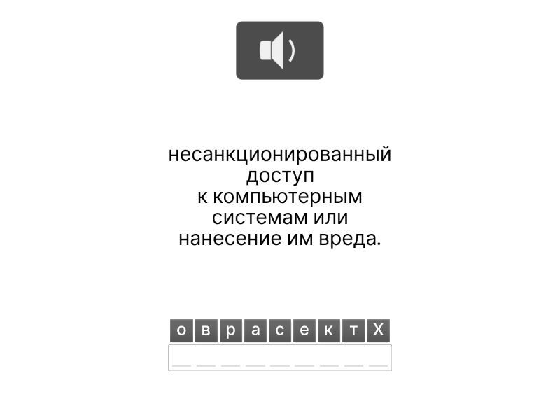 Хакерство - несанкционированный доступ к компьютерным системам или нанесение им вреда., Фишинг - способ получения личных данных путём обмана пользователей., Вредоносное ПО - вредоносные программы, созданные для нанесения ущерба компьютерной системе., Социальная инженерия - методы получения конфиденциальной информации путем манипуляции людьми., Кибербуллинг - оскорбления, унижения или запугивание через интернет., Защита данных - защита информации от несанкционированного доступа или кражи., Парольная безопасность - защита систем и данных с помощью надежных паролей., Интернет-мошенничество - мошенничество в интернете, приводящее к финансовому ущербу.,