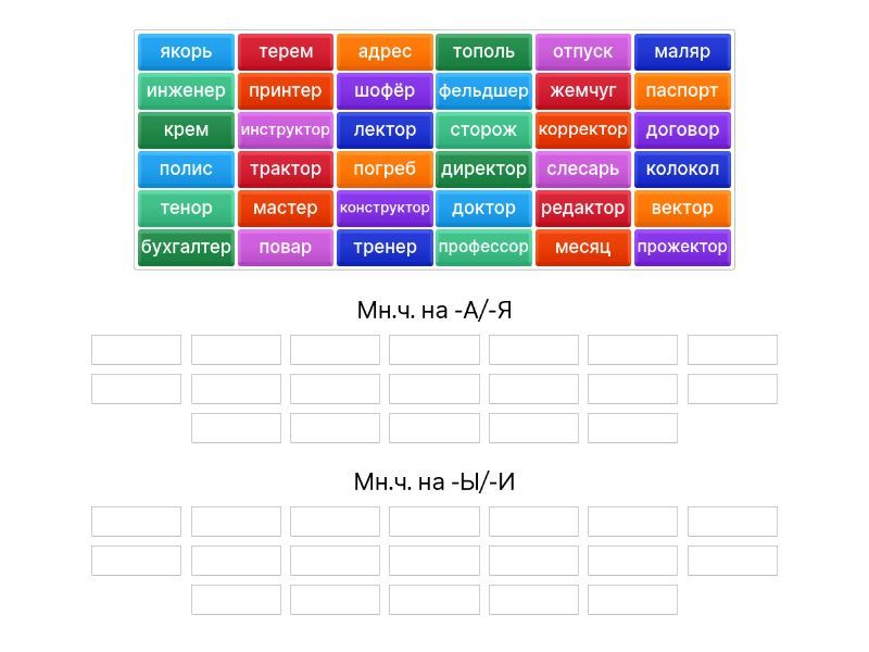 Мн.ч. на -А/-Я: адрес, доктор, директор, колокол, мастер, отпуск, паспорт, повар, погреб, профессор, сторож, тенор, тополь, фельдшер, якорь, жемчуг, терем, Мн.ч. на -Ы/-И: бухгалтер, договор, инженер, прожектор, корректор, конструктор, крем, лектор, редактор, полис, слесарь, трактор, тренер, месяц, шофёр, принтер, маляр, инструктор, вектор,