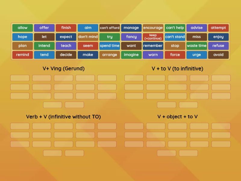 V+ Ving (Gerund): avoid, can't help, can't stand, don't mind, enjoy, fancy, finish, imagine, keep (=continue), miss, stop, spend time, waste time, V + to V (to infinitive): aim, arrange, attempt, can't afford, decide, expect, hope, intend, manage, offer, plan, refuse, remember, seem, tend, try, want, Verb + V (infinitive without TO): make, let, V + object + to V: force, allow, urge, warn, advise, encourage, remind, teach,