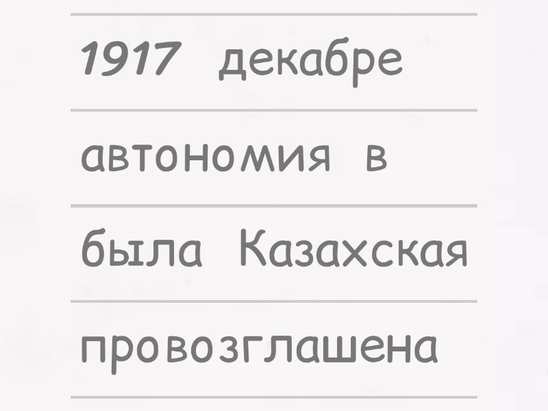 Казахская автономия была провозглашена в декабре 1917, Правительство автономии называлось Алаш-Орда, лавой (председателем) Алаш-Орды был избран Алихан Букейханов, Алашская автономия стремилась развивать школы и образование на казахском языке., В 1920 году была создана Казакская АССР, и автономия прекратила существование, Главными идеологами Алаш были Байтурсынов, Дулатов и Букейханов, Движение «Алаш» сыграло важную роль в формировании национальной государственностиКазахстана., Одним из главных печатных органов алашевцев была газета Казах, В состав правительства входило 25 человек., Многие лидеры движения Алаш были репрессированы в 1930,