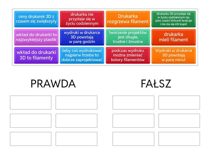 PRAWDA : wkład do drukarki 3D to filamenty , Drukarka rozgrzewa filament , drukarka 3D przydaje się w życiu codziennym np. jako części których brakuje i nie da się ich kupić , żeby coś wydrukować najpierw trzeba to dobrze zaprojektować , wydruki w drukarce 3D powstają w parę godzin , podczas wydruku można zmieniać kolory filamentów , FAŁSZ : drukarka mieli filament , drukarka nie przydaje się w życiu codziennym , wkład do drukarki to najzwyklejszy plastik , Wydruki w drukarce 3D powstają w parę minut , ceny drukarek 3D z czasem się zwiększyły , tworzenie projektów jest długie, trudne i żmudne ,