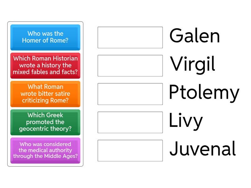 Which Roman Historian wrote a history the mixed fables and facts? - Livy, What Roman wrote bitter satire criticizing Rome? - Juvenal, Who was the Homer of Rome? - Virgil, Who was considered the medical authority through the Middle Ages? - Galen, Which Greek promoted the geocentric theory? - Ptolemy ,