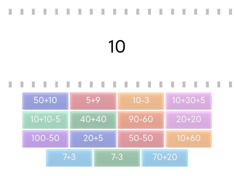 7+3 - 10, 5+9 - 14, 10-3 - 7, 7-3 - 4, 20+20 - 40, 20+5 - 25, 10+10-5 - 15, 90-60 - 30, 100-50 - 50, 70+20 - 90, 50-50 - 0, 10+60 - 70, 40+40 - 80, 10+30+5 - 45, 50+10 - 60,