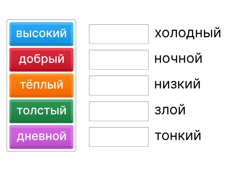 высокий - низкий, тёплый - холодный, дневной - ночной, толстый - тонкий, добрый - злой,