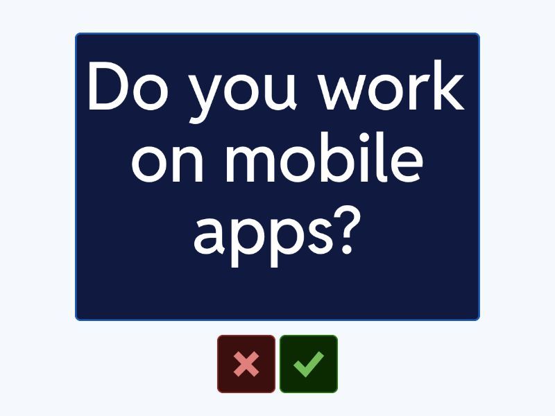 What do you do in IT?, Are you a developer?, Do you work online?, Do you work from home?, Do you work in an office?, Do you use a laptop at work?, Do you use a computer every day?, Do you like your job in IT?, Do you work in a team?, Do you write code?, Do you test software?, Do you fix bugs?, Do you use English at work?, Do you have many meetings?, Do you work with clients?, Do you like learning new tools?, Do you use Notion or Trello?, Do you use Slack or Telegram at work?, Do you have daily tasks?, Do you have deadlines?, Do you like working with technology?, Do you like simple tasks or difficult tasks?, Do you work on websites?, Do you work on mobile apps?, Do you like your project?,