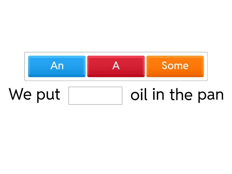 We put ____ oil in the pan We have ____ pear for the salad They buy ____ bananas at the market Please put ____ orange in the bowl We need ____ fork for the cake I need ____ ice for my soda