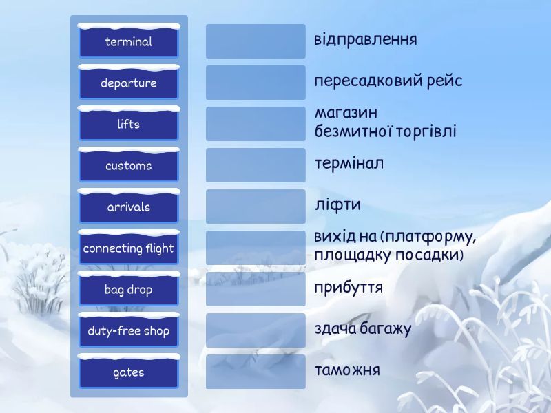 stopover - зупинка в дорозі, bag drop - здача багажу, arrivals - прибуття, baggage reclaim - зона видачі багажу, check-in - реєстрація, customs - таможня, departure - відправлення, gates - вихід на (платформу, площадку посадки), lifts - ліфти, passport control - паспортний контроль, terminal - термінал, trolley - візочок, security check - перевірки безпеки, connecting flight - пересадковий рейс, departure lounge - зал очікування, duty-free shop - магазин безмитної торгівлі, air traveller - авіапасажир,