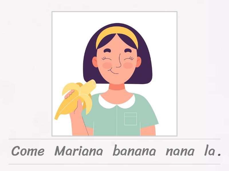 Mariana la nana Come banana., Trina trajo tres tritones., Fofa la foca fea, fue a flotar., Rosa rueda y remueve ramas., Pluton planea pegarse del plátano., El criollo cría una criolla creyente.,