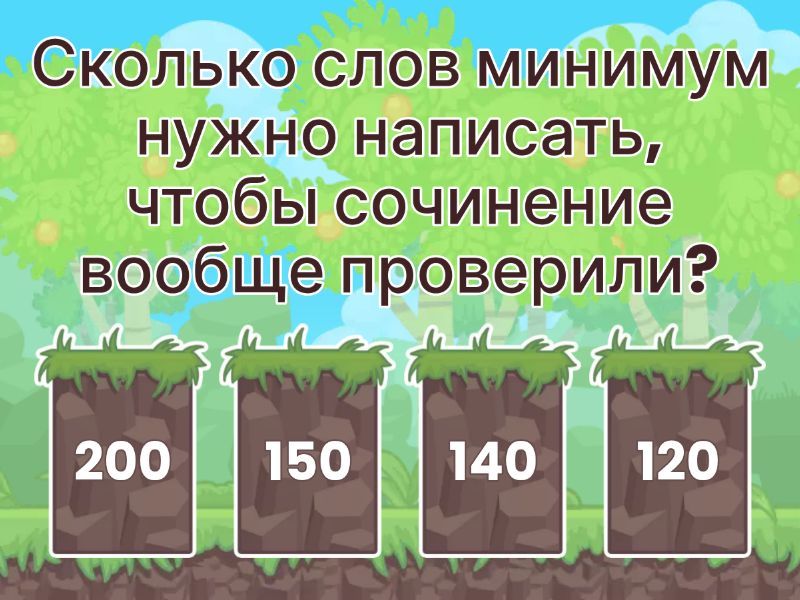 1) Сколько слов минимум нужно написать, чтобы сочинение вообще проверили? a) 120 b) 140 c) 150 d) 200 2) Что обязательно должно быть в структуре сочинения? a) Пересказ + вывод b) Два аргумента из жизни c) Проблема + комментарий + авторская позиция + своя позиция + вывод d) Эпиграф + рассуждение 3) Что такое проблема текста? a) Любая тема, про которую ты хочешь написать b) Главный вопрос, который поднимает автор c) Первое предложение текста d) Пересказ концовки 4) Что является проблемным вопросом? a) «Автор пишет о мечте» b) В тексте много размышлений о мечтах» c) «Мечта — важное понятие для каждого человека» d) «Какова роль мечты в жизни человека?» 5) Что главное в хорошем вступлении ЕГЭ? a) Красивые слова и цитаты b) Объём не менее 4 предложений c) указать проблемный вопрос и автора текста d) Пересказать текст заранее 6) Что допустимо во вступлении? a) Лёгкий философский заход b) Цитата при грамотном использовании c) Проблемный вопрос d) Всё перечисленное 7) Что такое авторская позиция? a) Личное мнение ученика b) Краткий пересказ текста c) Ответ автора на поставленную проблему d) Любая мысль, которая звучит красиво 8) Какая формулировка позиции автора корректна? a) «Автор говорит, что герой молодец, потому что мечтал» b) «Автор убеждён: мечта направляет человека и помогает преодолеть трудности» c) «Автор считает, что мечта бывает разной» d) «Автор пишет про мечту» 9) Авторская позиция должна: a) Повторять проблему почти дословно b) Давать ясный ответ на проблему c) Быть длиннее 3 предложений d) Пересказывать текст 10) Где смешение позиций ученика и автора? a) «Автор считает, что человеку важно прощать»Банально b) «Я считаю, что автор прав, потому что прощать — это важно» c) «Писатель подводит нас к мысли, что человек не должен быть равнодушным» d) «Автор убеждён в ценности доброты» 11) Что обязательно должно быть в комментарии? a) Два примера из текста + связь между ними b) Один пример и цитата c) Два примера из текста d) Два примера из текста с пояснениями + связь между ними 12) Можно ли использовать цитаты в примерах из текста? a) Можно, но коротко и осознанно b) Нельзя c) Можно выписывать полстраницы d) Только если текст — стихотворение 13) Сколько примеров-иллюстраций требуется в комментарии? a) Один пример из текста b) Два примера из текста c) Три примера из текста d) Сколько хочешь 14) Что считается примером-иллюстрацией? a) Пересказ сюжета без смысла b) Любой факт о герое c) Любое предложение из текста d) Анализ эпизода, связанный с проблемой 15) «Во-первых, герой мечтал стать сильным. Во-вторых, он хотел добиться успеха. Эти примеры связаны тем, что мечта — это мечта». a) Нет пояснений b) Нет связи между примерами c) Примеры нераскрытые и непонятные d) Всё перечисленное 16) Что такое пояснение? a) Объяснение, как пример раскрывает проблему b) Краткий пересказ текста c) Мнение ученика d) Повтор примера 17) Что будет, если написать один пример вместо двух? a) Снимут только 1 балл b) Снимут весь комментарий c) Поставят только один из трёх баллов d) Засчитают, если пример длинный 18) Какая связка примеров - НЕКОРРЕКТНА? a) «Примеры противопоставлены: первый раскрывает слабость героя, второй — силу» b) «Эти эпизоды дополняют друг друга, показывая развитие героя» c) «Эти примеры связаны тем, что мечта — это мечта» d) «Эпизоды отражают разные стадии пути героя» 19) Какой вариант — идеальная мини-модель комментария? a) Пример → Переска