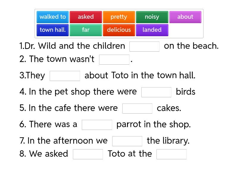 1.Dr. Wild and the children ____ on the beach. 2. The town wasn't ____. 3.They ____ about Toto in the town hall. 4. In the pet shop there were ____ birds 5. In the cafe there were ____ cakes. 6. There was a ____ parrot in the shop. 7. In the afternoon we ____ the library. 8. We asked ____ Toto at the ____
