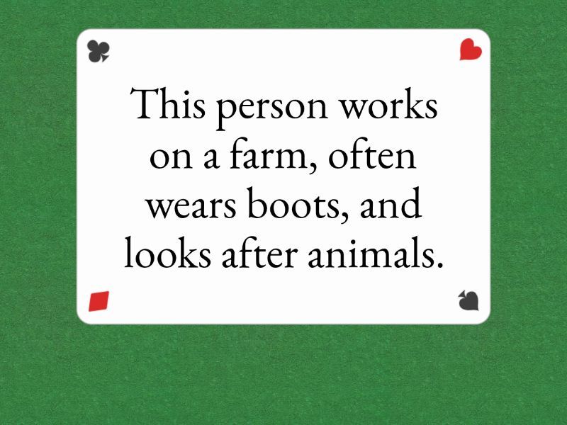 This person works in a hospital, wears a white coat, and helps sick people., This person works in a kitchen, wears an apron and a hat, and cooks delicious food., This person works on a farm, often wears boots, and looks after animals., This person works in a school, uses a board, and helps children learn., This person works in a salon, uses scissors, and changes people’s hairstyles., This person works in the sky, wears a uniform, and flies a big plane., This person works in a hotel, stands at the front desk, and helps guests., This person works in an office, uses a computer, and organizes documents., This person works at the police station, wears a uniform, and keeps people safe., This person works in a restaurant, carries a tray, and brings food to customers., This person works in a studio or on stage, uses a microphone, and performs music.,