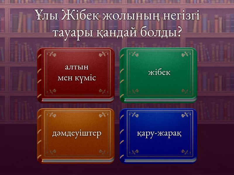 1) Ұлы Жібек жолының негізгі тауары қандай болды? a) алтын мен күміс b) жібек c) дәмдеуіштер d) қару-жарақ 2) Қазақстан аумағындағы қай қалалар Ұлы Жібек жолындағы ірі сауда орталықтары болды? a) Отырар, Тараз, Испиджаб b) Астана, Қарағанды, Павлодар c) Ақтау, Атырау, Орал d) Көкшетау, Петропавл, Қостанай 3) Көшпелілер отырықшы қала тұрғындарына немен айырбас жасады? a) жібек пен зергерлік бұйымдармен b) мал өнімдері (жүн, сүт, ет) мен қыш ыдыстармен c) қару‑жарақ пен ат әбзелдерімен d) дәмдеуіштер мен шыны бұйымдармен 4) Отырықшы қала тұрғындары көшпелілерге не өткізді? a) мал мен жүн b) егін өнімдері мен қолөнер c) аң терісі мен сүйек бұйымдары d) тас құралдар мен садақтар 5) Ортағасырлық қалаларда сауданы реттеу үшін не салынды?   a) мешіттер мен медреселер b) моншалар мен стадиондар c) базарлар мен караван‑сарайлар d) сарайлар мен қамалдар 6) Айша бибі кесенесі қандай сәулет стилінде салынған? a) готикалық b) романдық c) исламдық сәулет (ою‑өрнек, күмбез) d) классикалық 7) Қожа Ахмет Йасауи кесенесі қай ғасырда салынды? a) V–VI ғғ. b) VIII–IX ғғ. c) X–XI ғғ. d) XIV–XV ғғ. 8) Ұлы Жібек жолы арқылы қандай діндер Қазақстанға тарады? a) буддизм, манихейлік, ислам b) христиандық, иудаизм, зороастризм c) синтоизм, конфуцийшілдік, даосизм d) индуизм, сикхизм, джайнизм