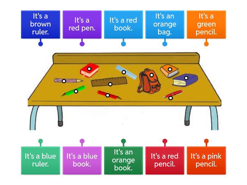 It's a red book., It's a red pencil., It's a green pencil., It's an orange book., It's a blue book., It's a brown ruler., It's a blue ruler., It's a pink pencil., It's a red pen., It's an orange bag..