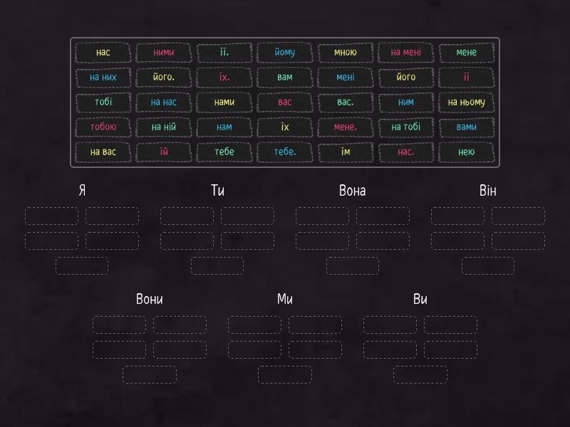 Я: мене, мені, мене., мною, на мені, Ти: тебе, тобі, тебе., тобою, на тобі, Вона: її, їй, її., нею, на ній, Він: його, йому, його., ним, на ньому, Вони: їх, їм, їх., ними , на них, Ми: нас, нам, нас., нами, на нас, Ви: вас., вам, вас, вами, на вас,