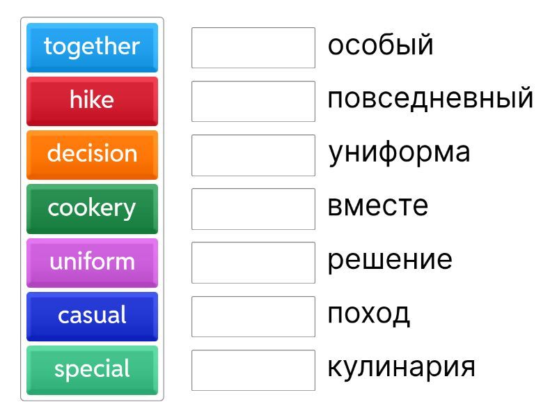 decision  - решение, blank - пустой, yoga - йога, cookery - кулинария, business skills - деловые навыки, timetable  - расписание, e-mail - электронное письмо, special  - особый, relationship  - взаимоотношение, together - вместе, hike - поход, uniform - униформа, casual - повседневный,