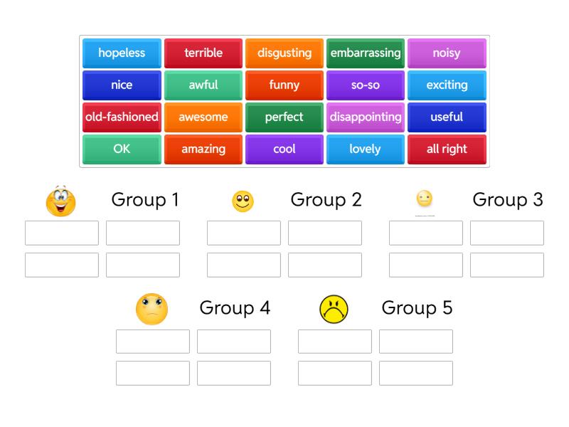 Group 1: amazing, awesome, exciting, perfect, Group 2: cool, funny, lovely, useful, Group 3: OK, nice, all right, so-so, Group 4: old-fashioned, noisy, embarrassing, disappointing, Group 5: awful, terrible, hopeless, disgusting,