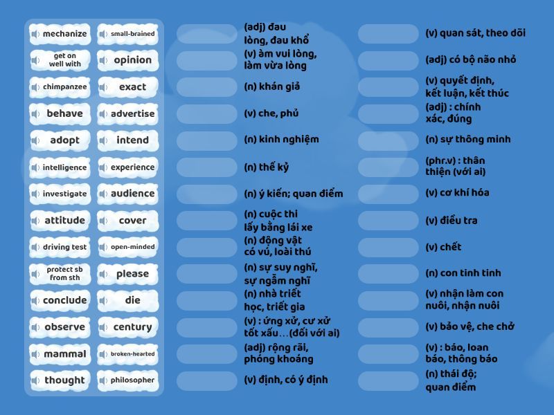 experience - (n) kinh nghiệm, driving test - (n) cuộc thi lấy bằng lái xe, please - (v) àm vui lòng, làm vừa lòng, exact - (adj) : chính xác, đúng, investigate - (v) điều tra, audience - (n) khán giả, intend - (v) định, có ý định, philosopher - (n) nhà triết học, triết gia, advertise - (v) : báo, loan báo, thông báo, get on well with - (phr.v) : thân thiện (với ai), thought - (n) sự suy nghĩ, sự ngẫm nghĩ, protect sb from sth - (v) bảo vệ, che chở, chimpanzee - (n) con tinh tinh, small-brained - (adj) có bộ não nhỏ, behave - (v) : ứng xử, cư xử tốt xấu…(đối với ai), die - (v) chết, mammal - (n) động vật có vú, loài thú, broken-hearted - (adj) đau lòng, đau khổ, open-minded - (adj) rộng rãi, phóng khoáng, adopt - (v) nhận làm con nuôi, nhận nuôi, attitude - (n) thái độ; quan điểm, century - (n) thế kỷ, mechanize - (v) cơ khí hóa, opinion - (n) ý kiến; quan điểm, observe - (v) quan sát, theo dõi, cover - (v) che, phủ, conclude - (v) quyết định, kết luận, kết thúc, intelligence - (n) sự thông minh,